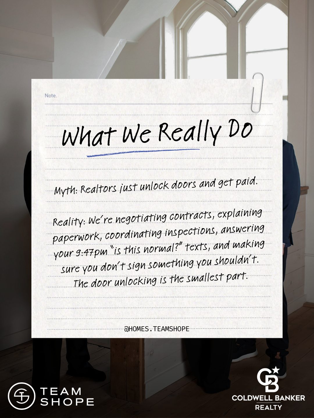 Honestly, that seems like every person’s dream job (mine included lol – seriously, if someone has a job offer like that, sign me up). I bet every realtor wishes that scenario was their life. In reality, they’re negotiating contracts, explaining paperwork, coordinating inspections, answering your 9:47 pm “is this normal?” texts, and making sure you don’t sign something you shouldn’t. All of these things your realtor is doing, not only for you, but for all their other clients. The door unlocking? That’s one of the highlights.